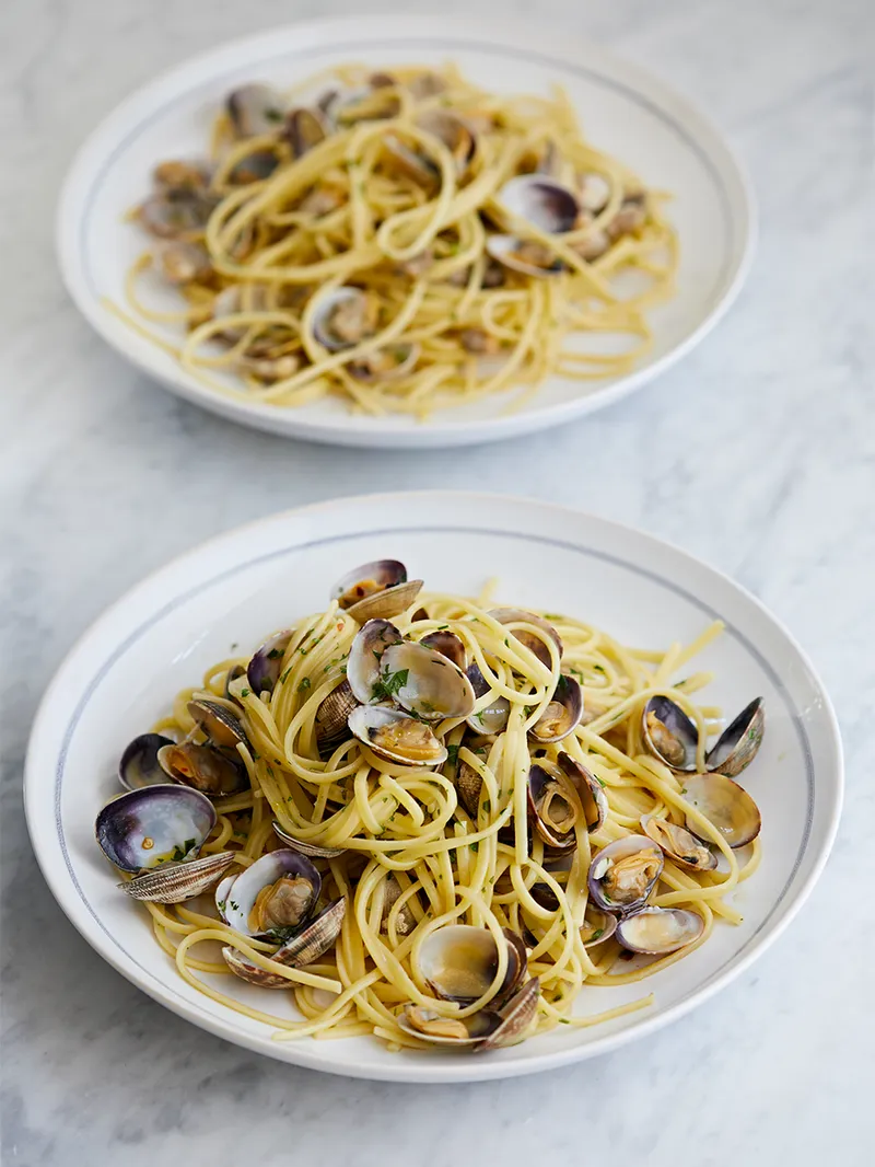- Using tongs, drag the pasta straight into the pan of clams, then simmer for a minute or two in all the delicious juices.