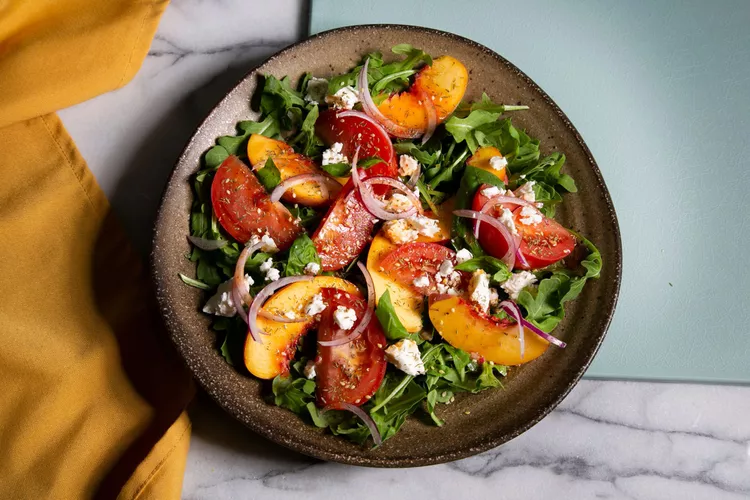 Tangy, sweet tomatoes and peaches are one of our favorite combinations for late summer eating. Here, they star in a salad atop a bed of peppery arugula and basil. The salad gets even more zip with a sweet-spicy vinaigrette made with candied jalapeños or pepper jam. The feta and sliced onion scattered on top add …