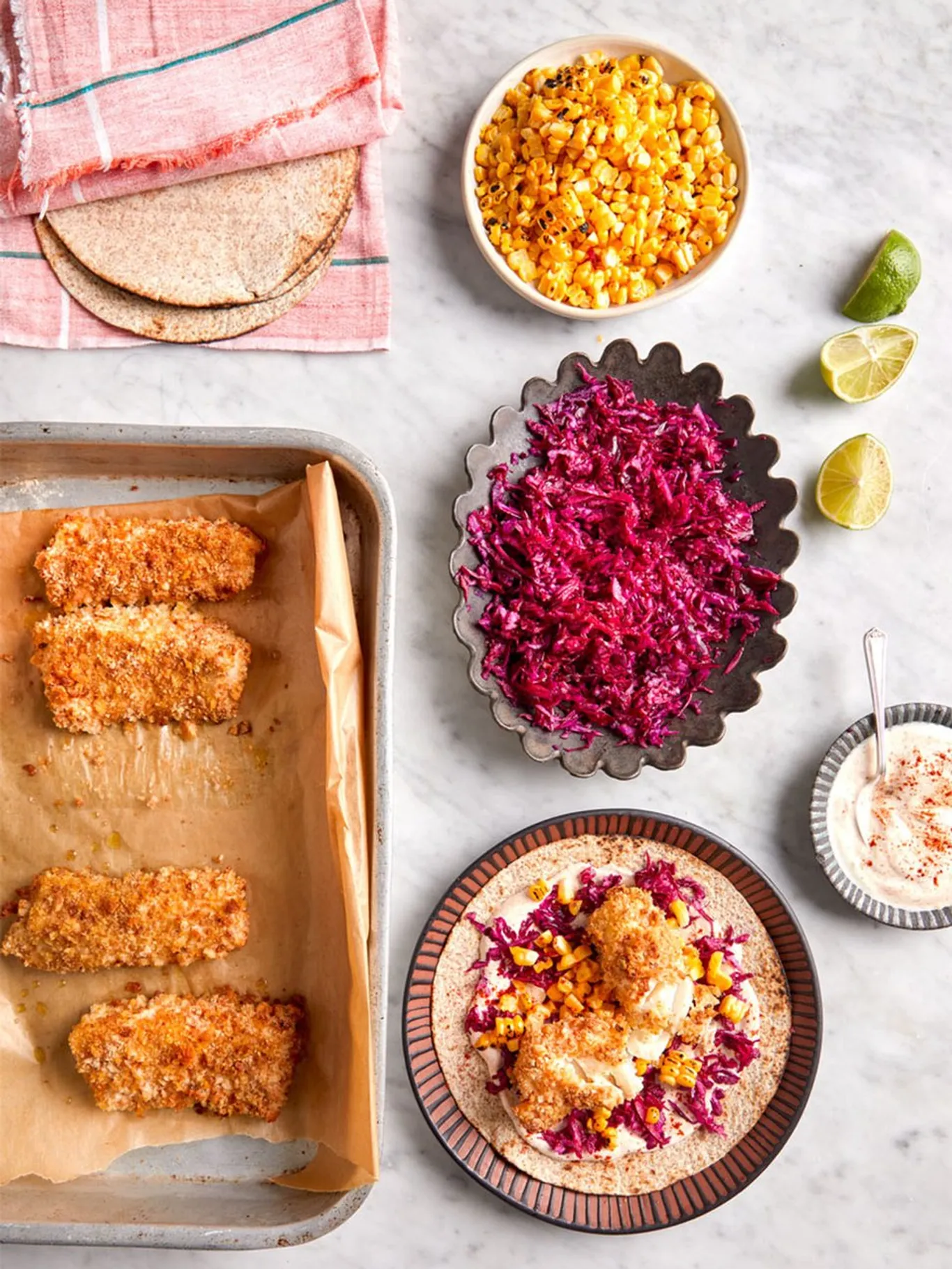 Fish Tacos with Creamy Lime Guacamole and Cabbage Slaw