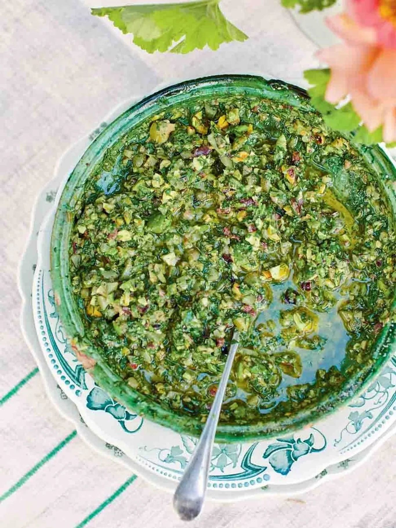 Ingredients 1 heaped tablespoon shelled unsalted pistachios 1 heaped tablespoon mixed-colour olives, stone in 1 heaped tablespoon baby capers in brine 1 heaped tablespoon baby cornichons 4 anchovy fillets in oil, from sustainable sources 2 teaspoons English mustard 1 bunch of mint (30g) 1 bunch of flat-leaf parsley (30g) red wine vinegar extra virgin olive …