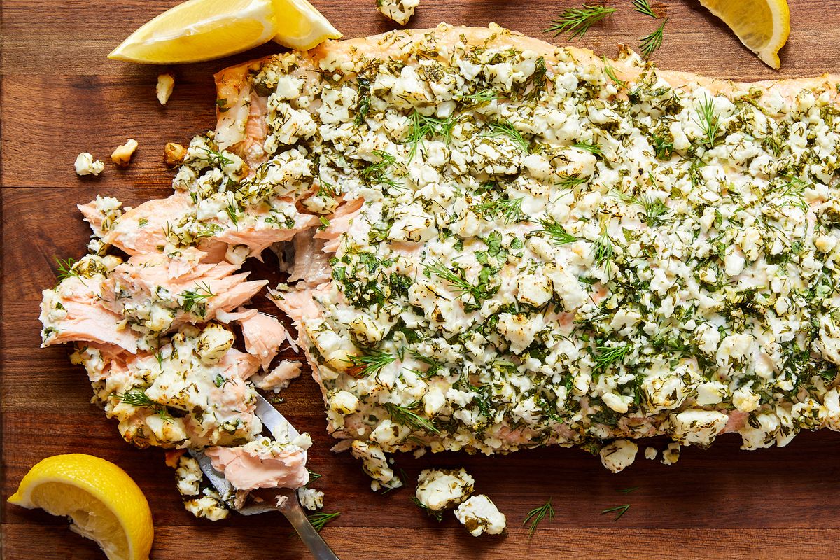 The key to getting the feta topping to adhere to the salmon is a smear of mayonnaise. It helps create a briny and herby crust that complements each bite of the tender fish. If you’re not a mayo fan, you could try skipping it (or swapping it for something lighter, like Dijonnaise), but keep in mind that you’re running the risk of losing that topping as you cut into the fish.