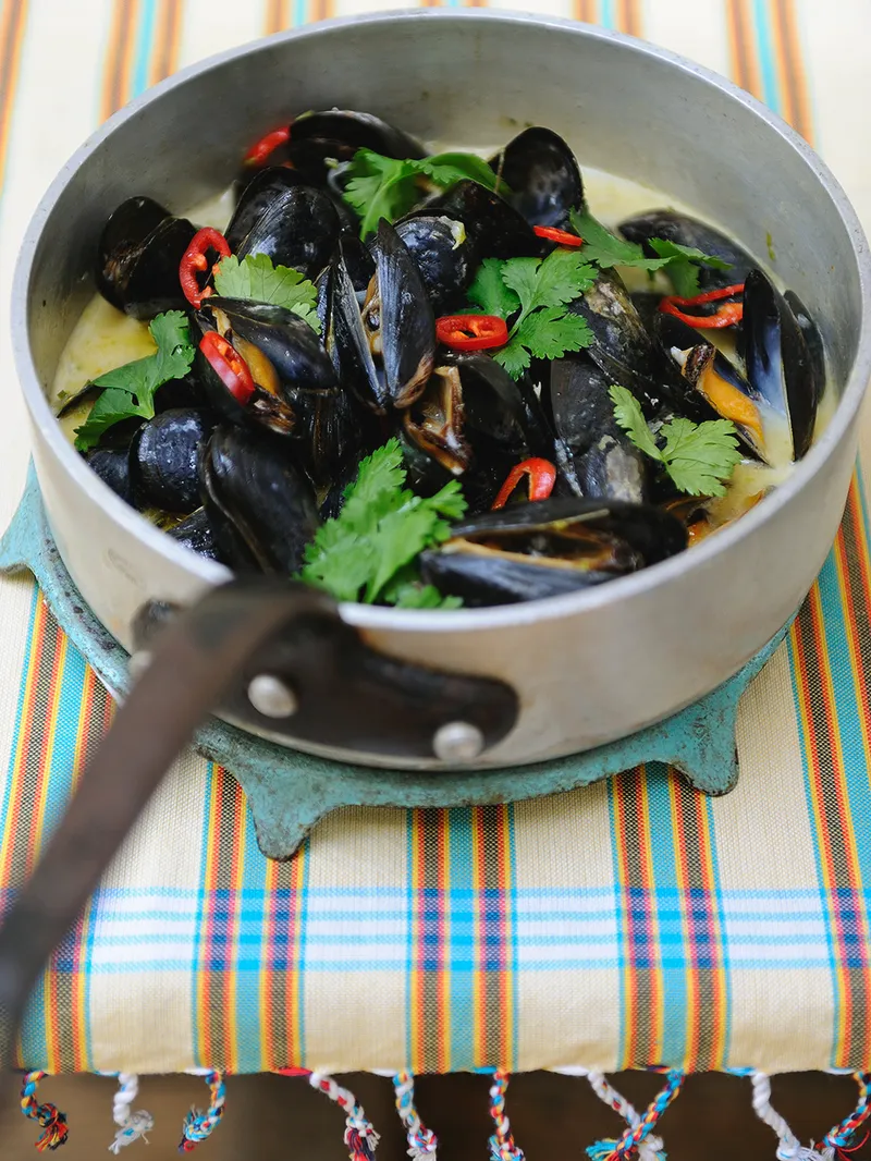 - Add a splash of oil and fry the chilli paste for a few seconds, until the oil turns red, then add the galangal, chillies, shallots and coriander stalks and cook for 2 to 3 minutes, or until the shallots soften.