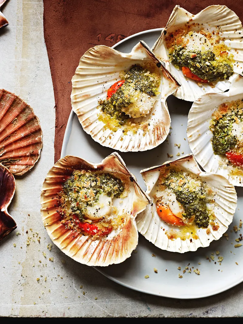 - 12 scallops , roe attached and shells reserved, from sustainable sources