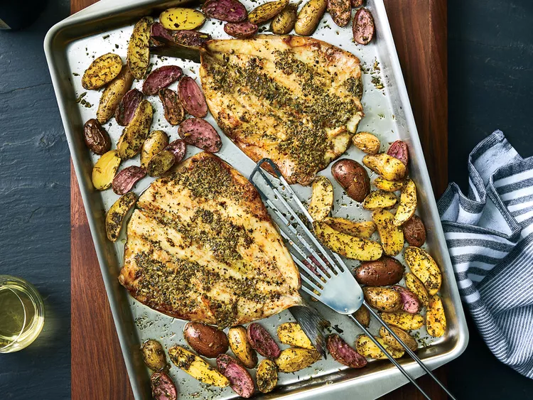 Flip potatoes and arrange around edges of pan to accommodate fish. Add fish to baking sheet, flesh side up, and roast at 375°F until fish is opaque and flaky and potatoes are cooked through, about 10 minutes.