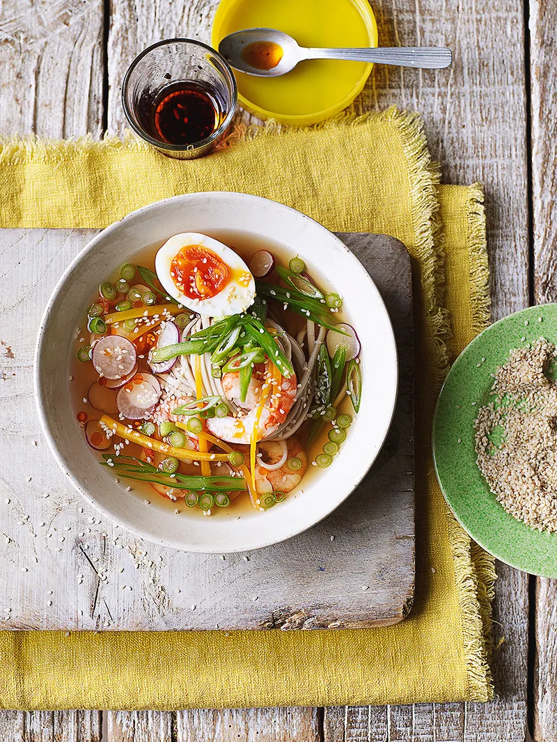 3. While the oil is heating, make the batter. Whisk the yolks into 350ml of iced water, then stir in the flours – don’t whisk till it’s completely smooth, you want a few lumps.