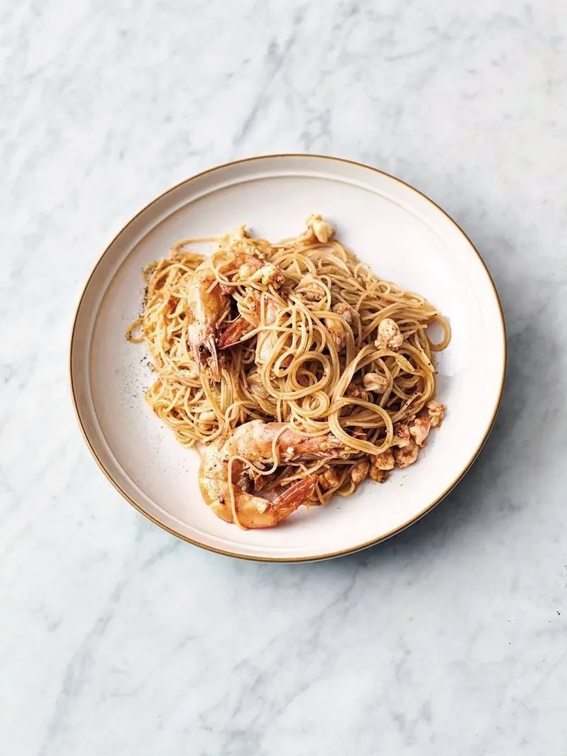 - Drain the pasta, reserving a mugful of cooking water, then toss the pasta into the prawn pan, loosening with a little reserved cooking water, if needed.