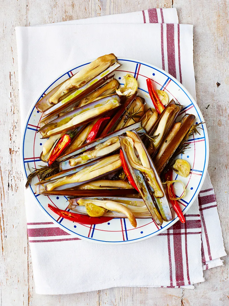 - Add the mussels, clams, squid and peas to the pan with a splash of water, if needed, then cover and leave for a few minutes, or until the mussels and clams have opened (discard any that remain closed).